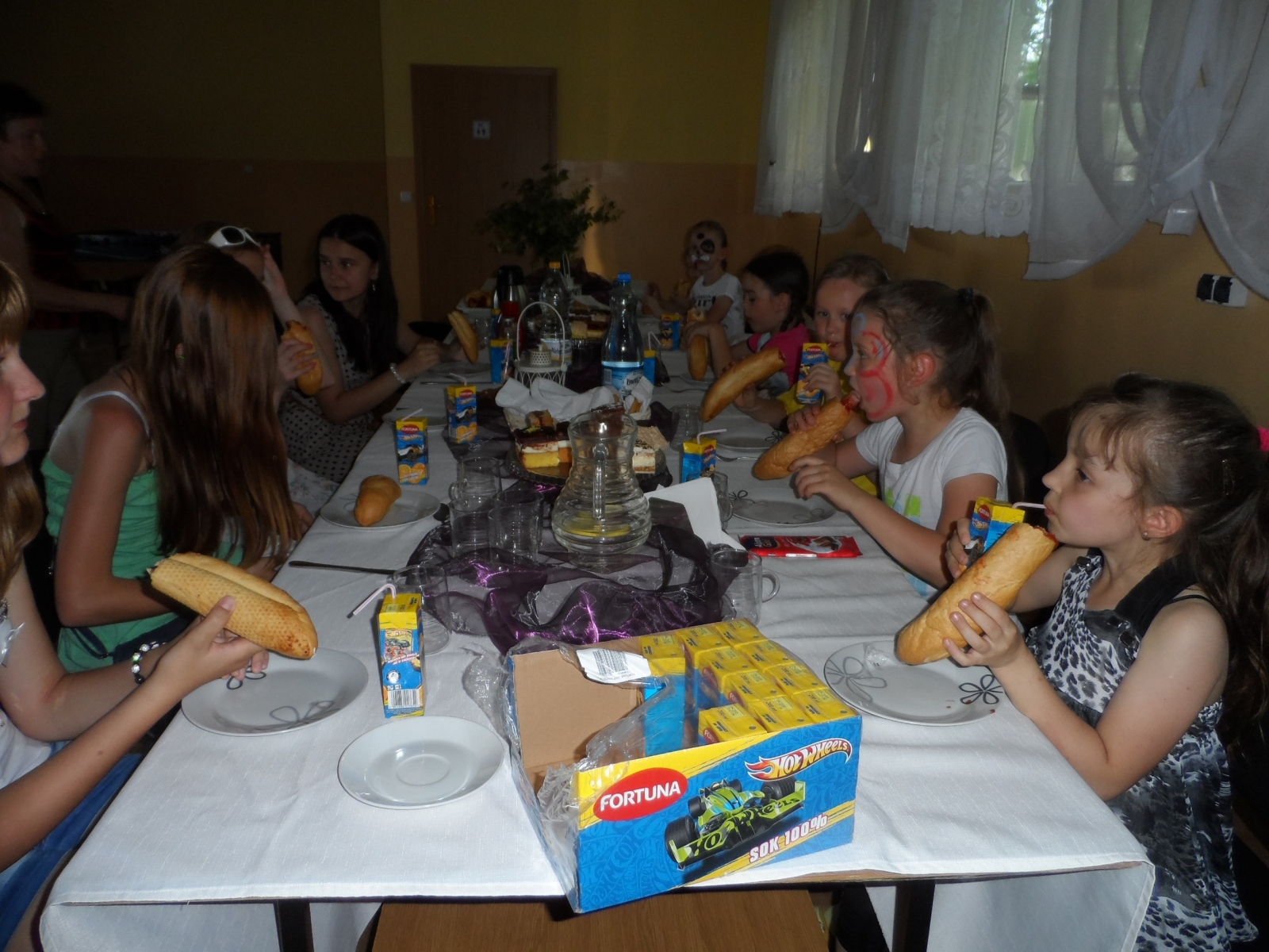 Pomyślano również o posiłkach dla maluchów. Każde dziecko dostało hot-doga i soczek, popcorn i słodkości: pączki, ptysie i eklerki. Rodzice mogli skorzystać z kawy, herbaty i wypieków domowych naszych Pań oraz owocowych szaszłyków z czekoladowego fondue. Oferowano swojski chleb ze smalcem i ogórkiem oraz kiełbaski i kaszanki z grilla.