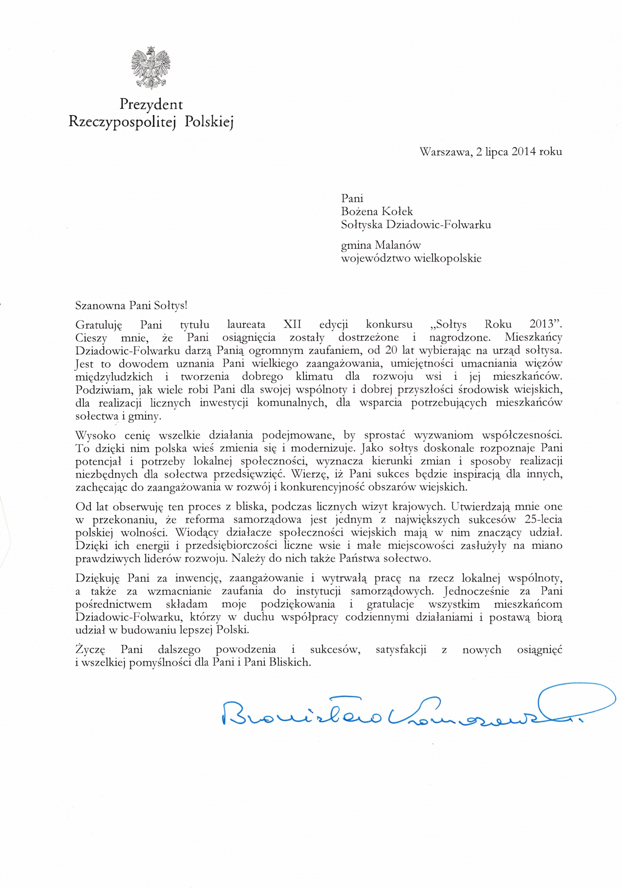 Jesteś tutaj: Strona główna » Dziadowice-Folwark » Aktualności » "... składam moje podziękowania i gratulacje wszystkim mieszkańcom Dziadowice - Folwarku ..."