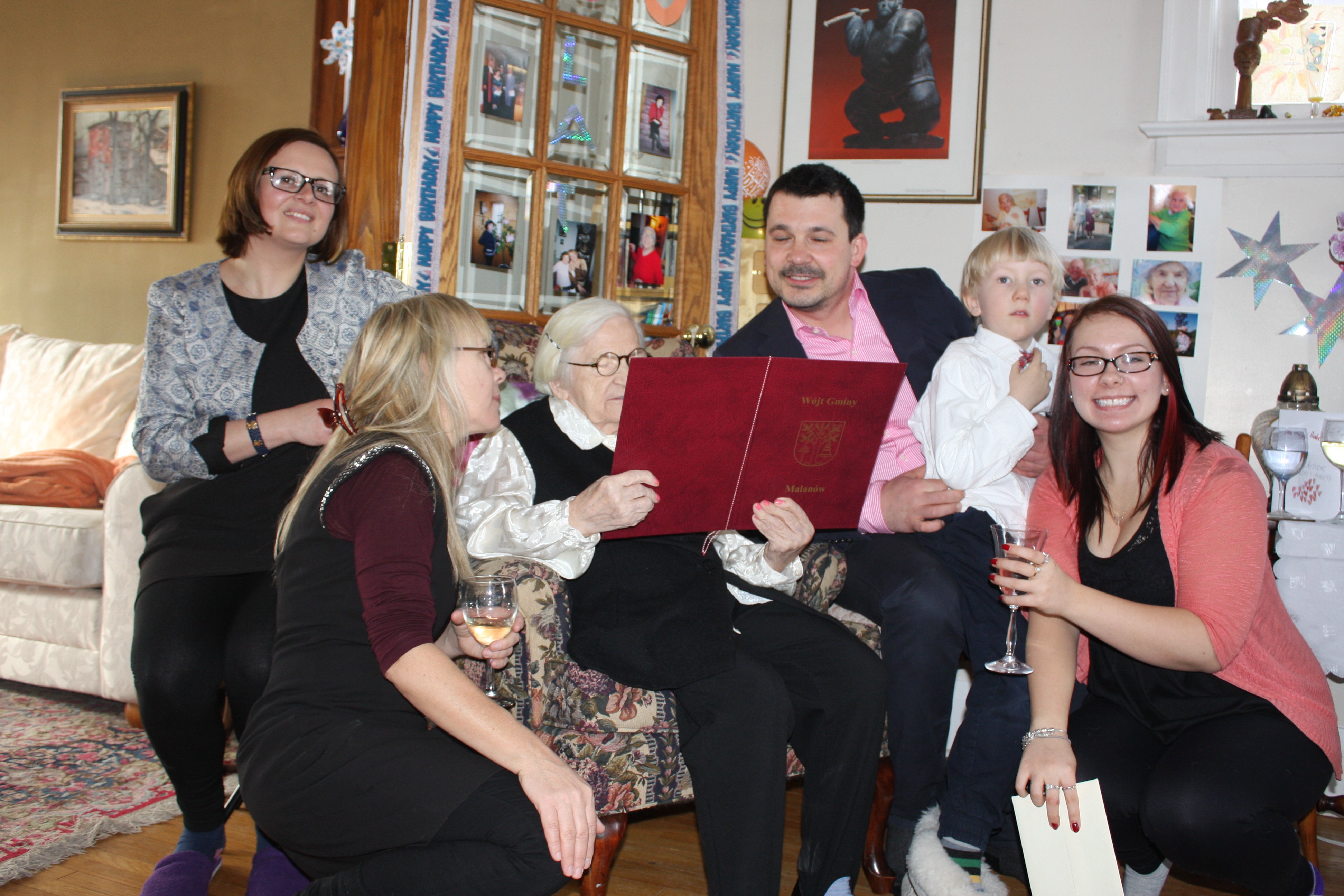 Dużo zdrowia, pomyślności i pogody ducha przesyłał Pan wójt w liście dla Pani Walerii Rogalskiej. Jubileusz obchodzony był 14 lutego w Walentynki. Rodzina, wnuki oraz zaprzyjaźnieni księża z polskiej parafii w Oshawie gościli u pogodnej Jubilatki. Pomimo zimnej aury, której w Polsce brak wizyta udała się znakomicie.